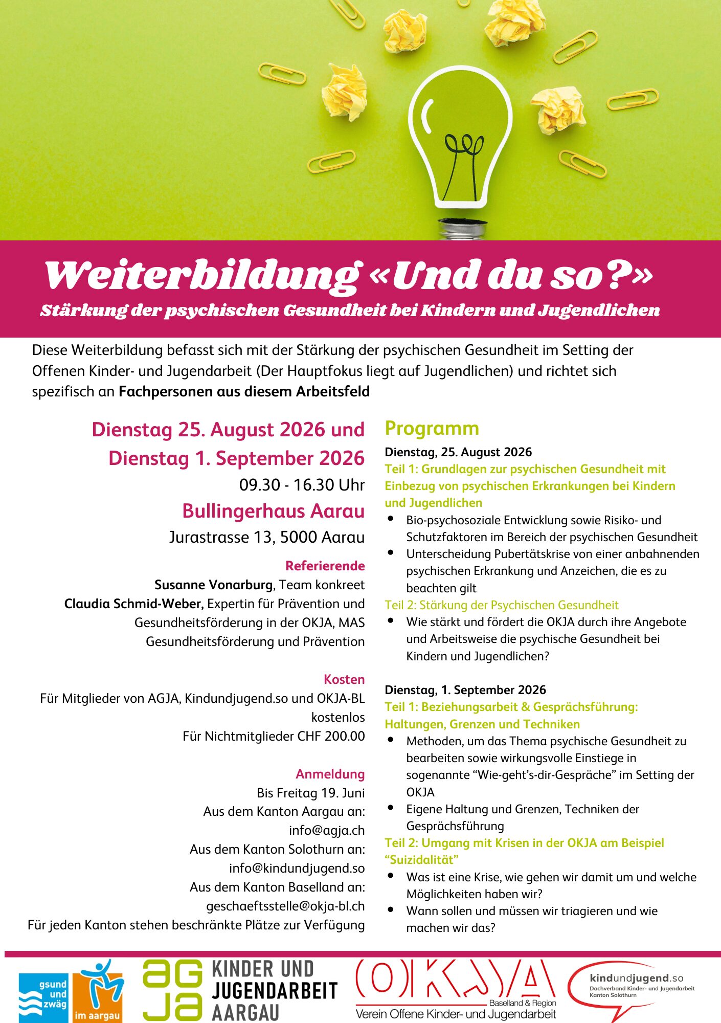 Und du so?“ vermittelt Fachpersonen der Offenen Kinder- und Jugendarbeit Wissen zu psychischer Gesundheit und psychischer Erkrankung. Die zweitägige Weiterbildung ist spezifisch auf das Berufsfeld der Offenen Kinder- und Jugendarbeit ausgerichtet und bietet eine vertiefte Auseinandersetzung mit dem Thema. Undduso? stellt den Fachpersonen neben der Weiterbildung auch Methoden und Hilfsmittel zur Verfügung. Die „undduso?“ Weiterbildungen sind in der Zusammenarbeit von dem Dachverband Offene Kinder- und Jugendarbeit Schweiz (DOJ) und dem kantonalen Dachverband der Offenen, verbandlichen und kirchlichen Kinder- und Jugendarbeit (okaj zürich) in Begleitung eines Praxisbeirates erarbeitet bzw. weiterentwickelt worden und werden in der ganzen Schweiz multipliziert.